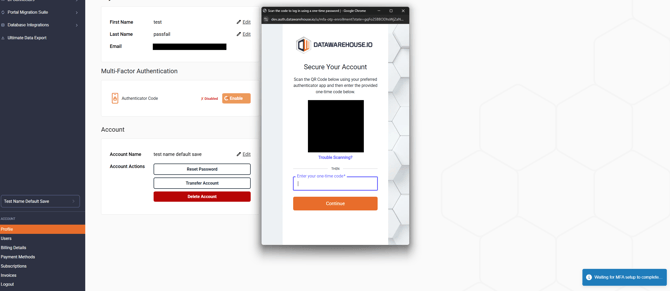 To enable MFA for a users Datawarehouse.io account they must log into the account that they are the Account Owner of and visit https://app.datawarehouse.io/account/profile. Once a user enables MFA for their user account they will be forced to use MFA when logging into any Datawarehouse.io account that they have access too.