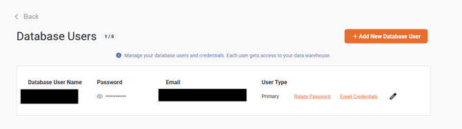 - You can add and manage additional database users by clicking on and using this feature here (see Manage Database Users subsection below for more details).