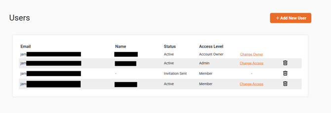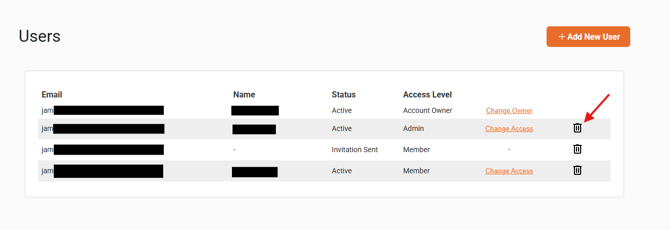 - To remove a user you must select the trash can icon in the row of the user account you want to remove. This will remove the users access from your account. It will not delete the user account completely.